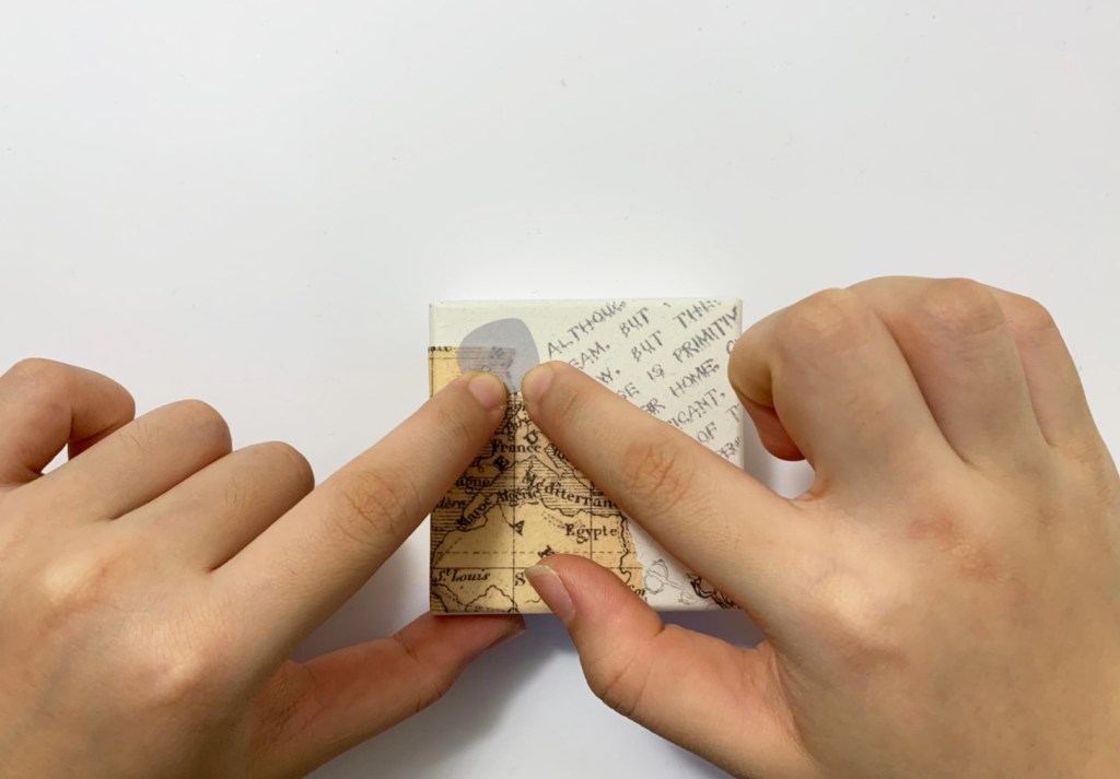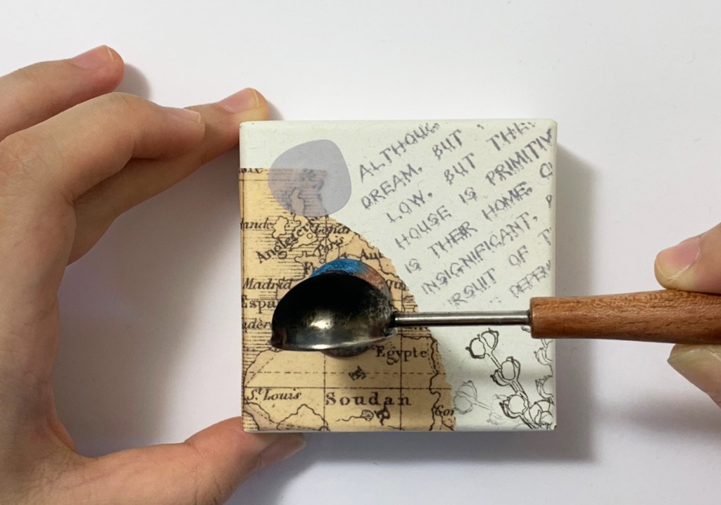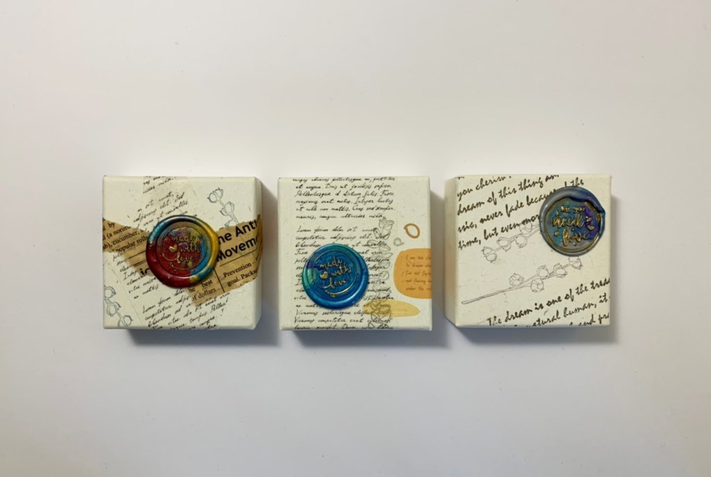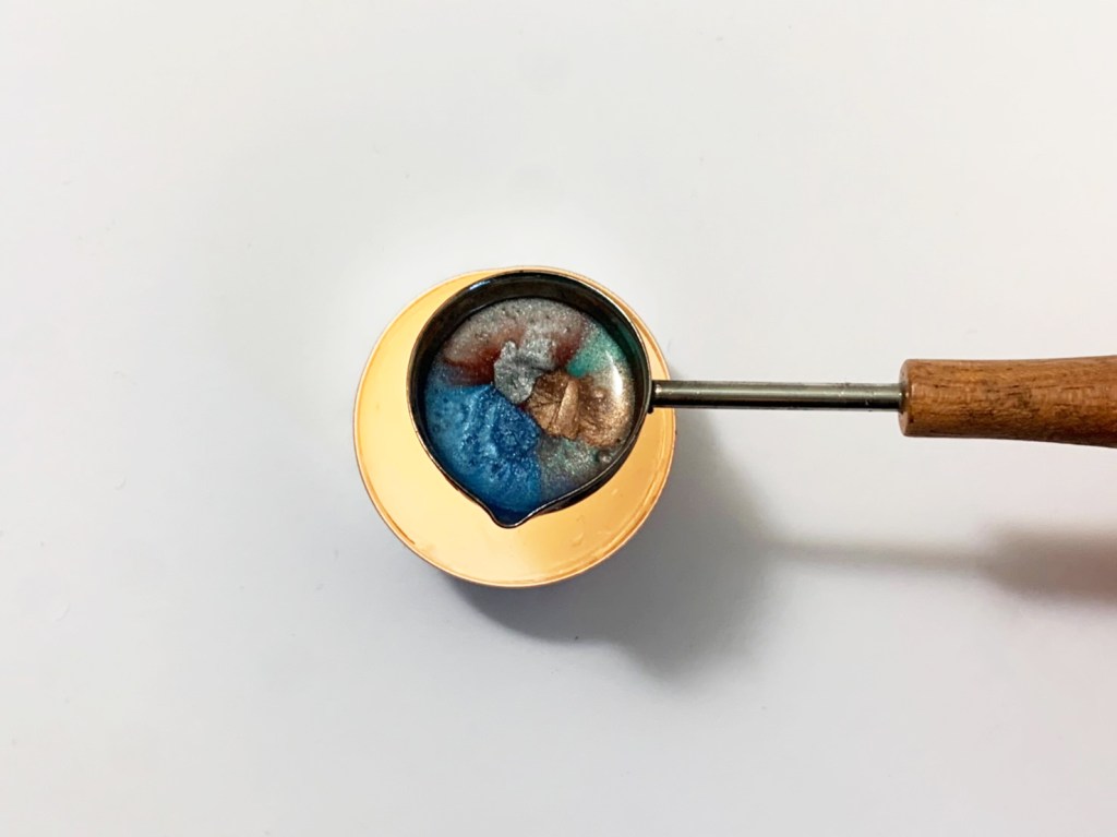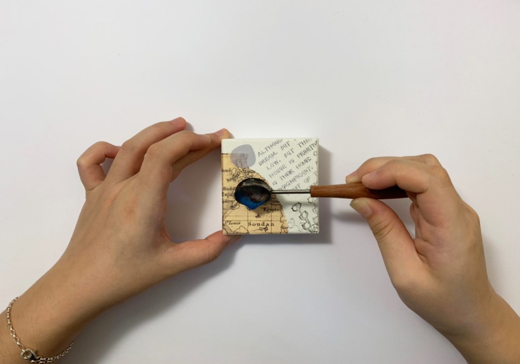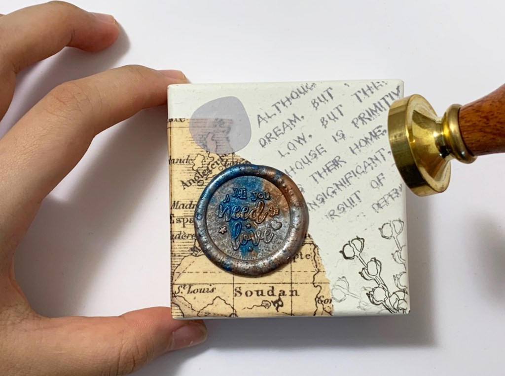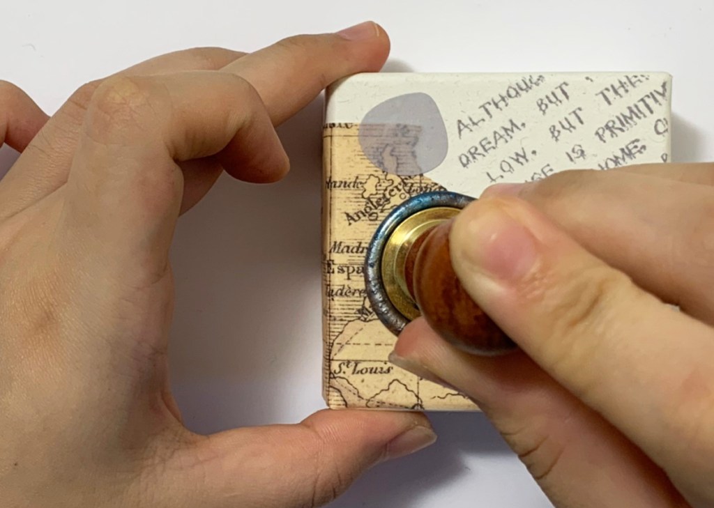 接著就可以把蠟封章蓋上囉,蓋的時候不需施太多力氣,避免太大力蠟會整個移動。蓋上後靜置10秒左右,等待蠟冷卻後,再慢慢將印章拿起 。