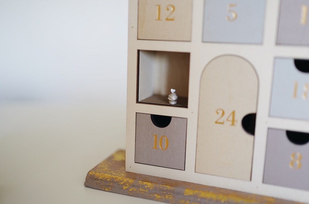 在工作室的話呢,我們準備了一天一個純銀墜飾,都是很有節慶感的設計,像是蝴蝶結、精靈小帽、杯子蛋糕、三角巧克力等等。只要是12月參加工作室的體驗課程,會從每天的學員中,抽出一位幸運兒獲得當天打開倒數小抽屜的機會!