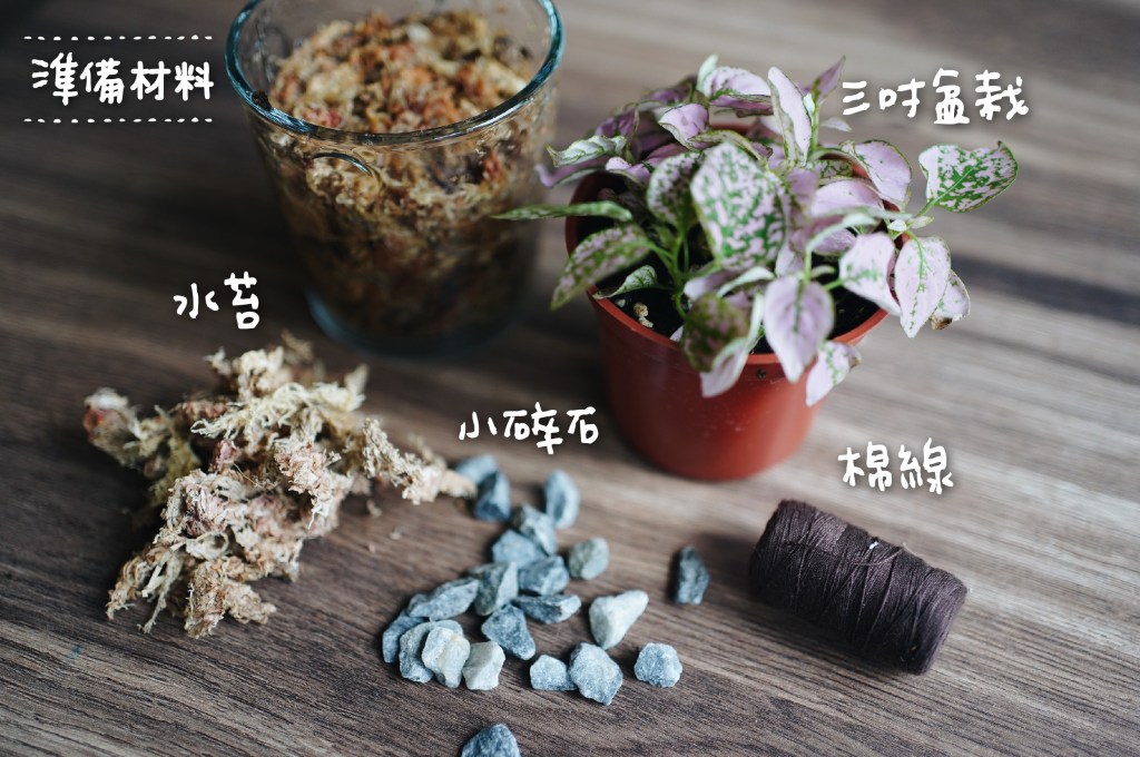 三吋盆栽、水苔(需預先泡水)、棉線、小碎石、塑膠袋、水杯