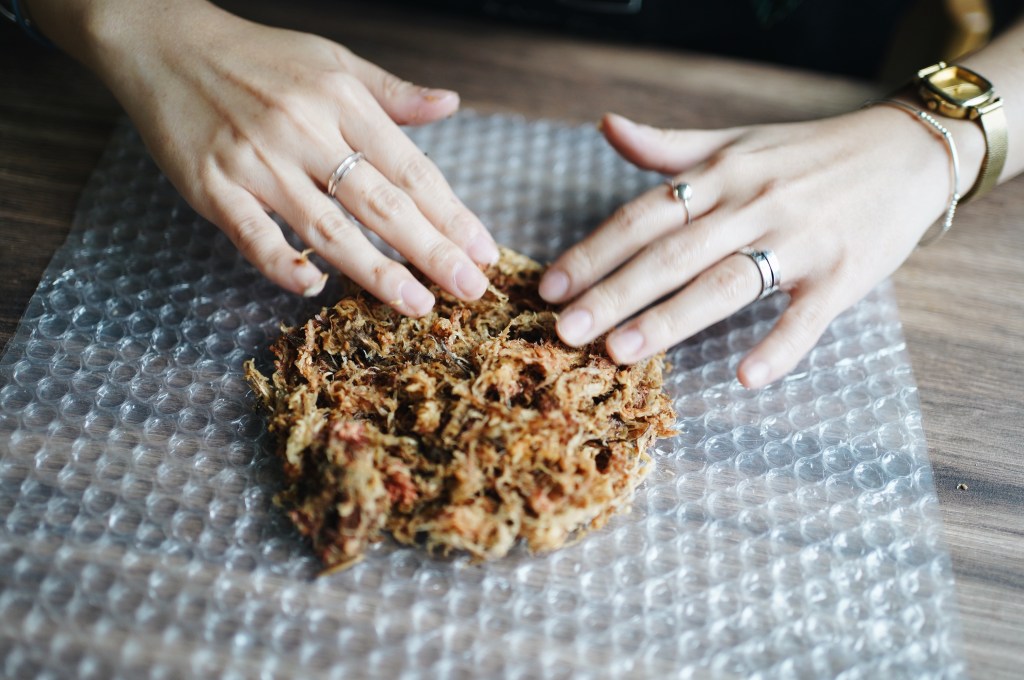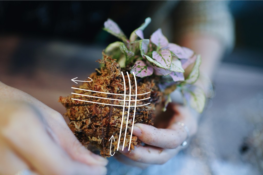 用虎口固定植物上緣,另一隻手用掌心的力量,將水苔多餘的水分擠出,完成第一次塑形,塑膠袋移開後,再次固定塑形(可以用一點力!)