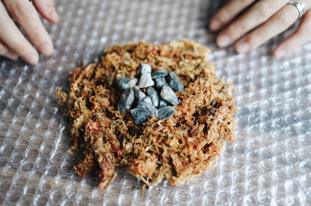 取適量水苔(大約壘球大小),攤平在塑膠袋上方,在水苔中間放上小碎石,目的是增加苔球重心,有了小石子,水苔內部也會比較透氣噢!