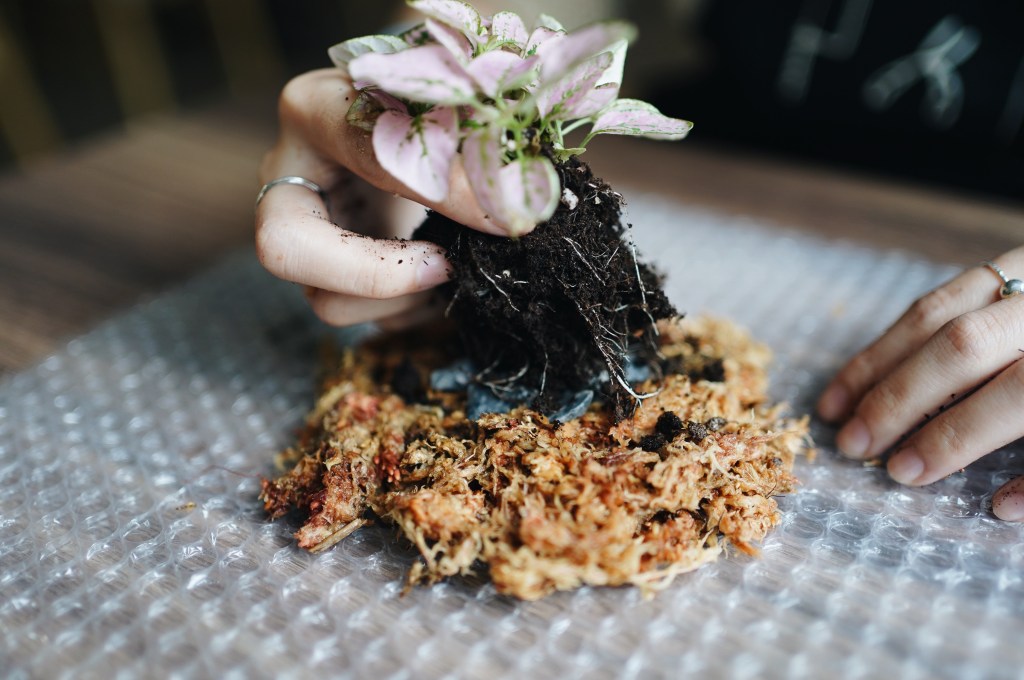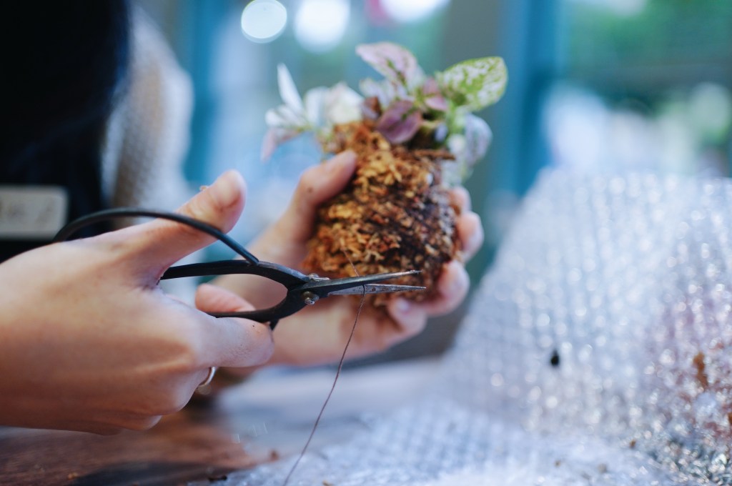 從盆中取出適量植物,這次示範的植物是:網紋草。植物要留適量的培養土哦~待會一起包進水苔裡。