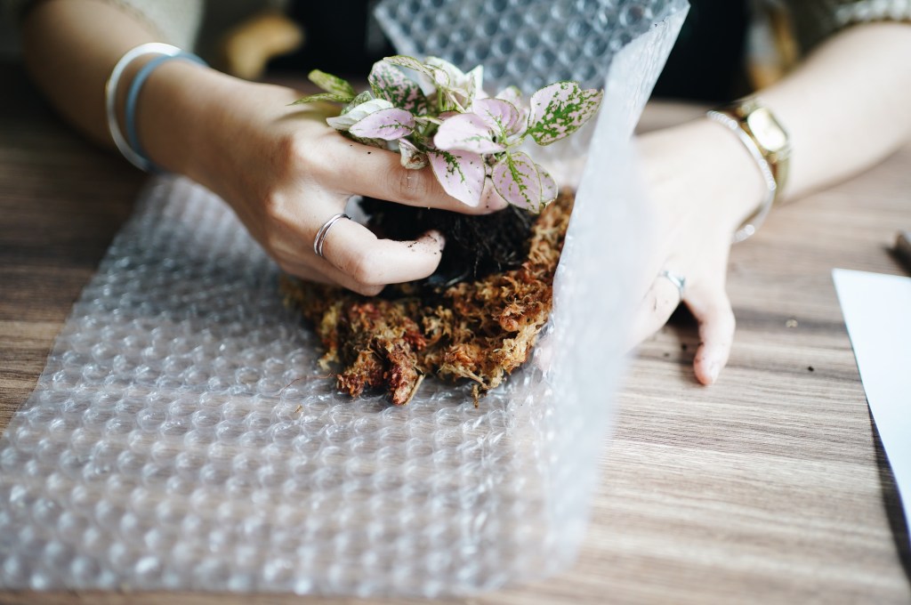植物放在水苔上,像包飯糰一樣,將塑膠袋四方往內靠緊。
