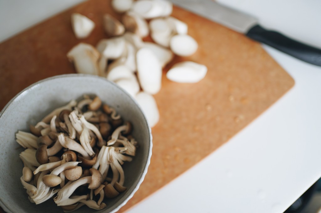 原本這道菜要用奶油和菇用烘培紙包起來放氣炸鍋的,要開工了才發現奶油沒了,沒辦法只好把奶油換成蝦(不知道什麼邏輯),總之要讓菇也很有風味!調味只撒了一點蒜味鹽,調味比較清淡,最後乾脆也搭配一點蔥鹽超加分!