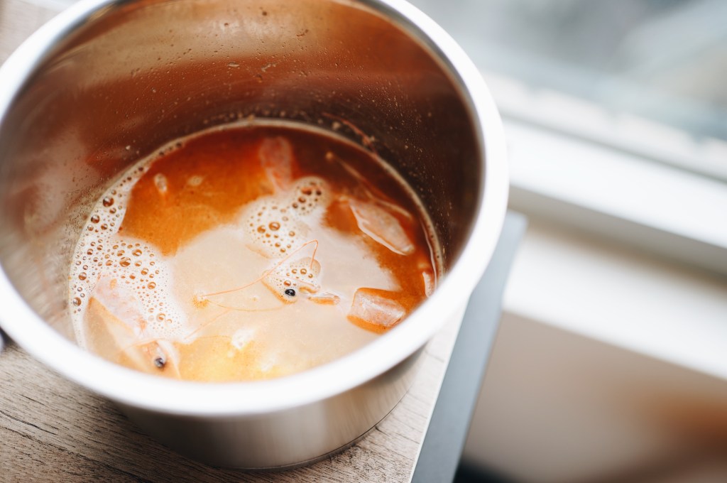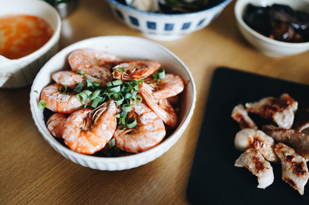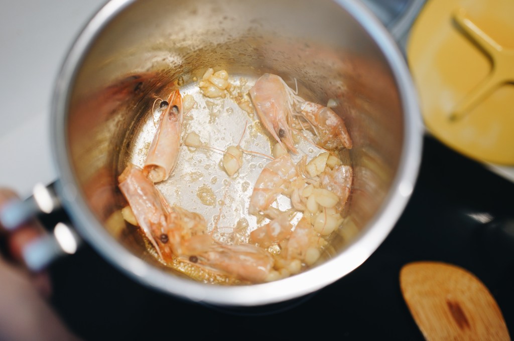 為了一碗菇解凍一盤蝦,留了四隻做味噌湯!蝦剝殼後把殼和蝦頭、蒜頭碎用稍微多一點點的橄欖油炒香,加水燉煮,有昆布的話也可以放進去一起熬一下,剛好松阪豬很多我也放了幾片一起進去煮。大概20分鐘就可以過濾出清湯,加入味增,水煮松阪豬吃掉,再把蝦身放進去煮熟,湯就上桌!