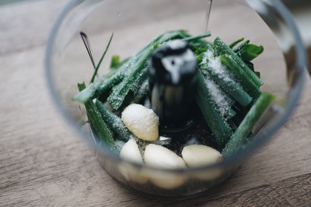 蔥鹽自己做:一把蔥切段、大蒜幾顆、鹽適量,用調理機打一打迅速完成!可以依照喜歡的鹹度做調整,也不放任何油,整體很清爽!沒有調理機也沒關係,全部切碎後加上鹽巴,可以用湯匙背面稍微把蔥蒜和鹽再搗碎混和,就可以完成自製蔥鹽了!