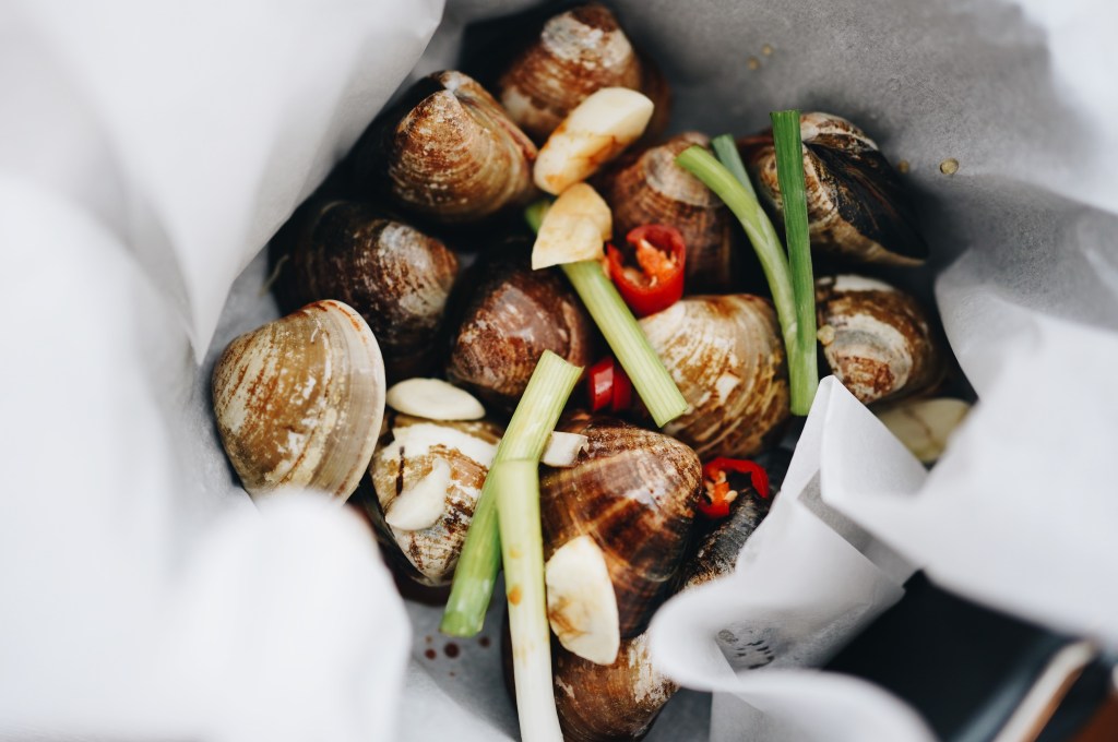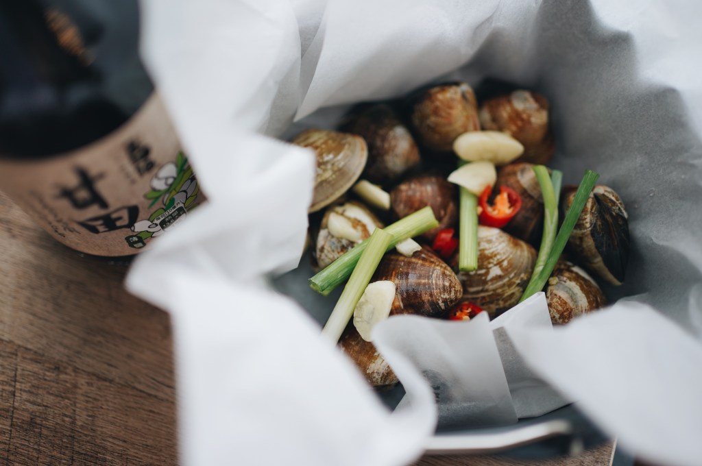 烘培紙把蛤蠣、蔥段、大蒜切片、辣椒切片、醬油(我選有點甜味的)一小匙、米酒一大匙!包起來直接放電鍋裡蒸大概15分鐘到蛤蠣打開就完成,烘培紙包的時候要預留蛤蠣打開的空間噢!