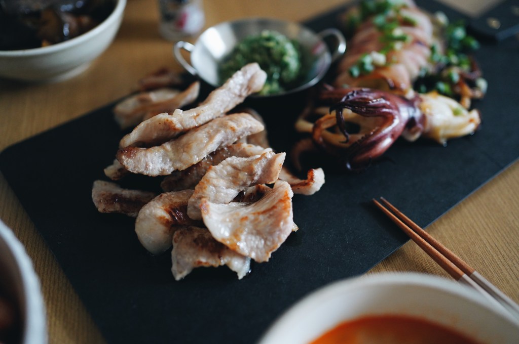 松阪豬切片亂煎到表面金黃,豬肉完全不用事先調味,搭配一點蔥鹽就很好吃!
