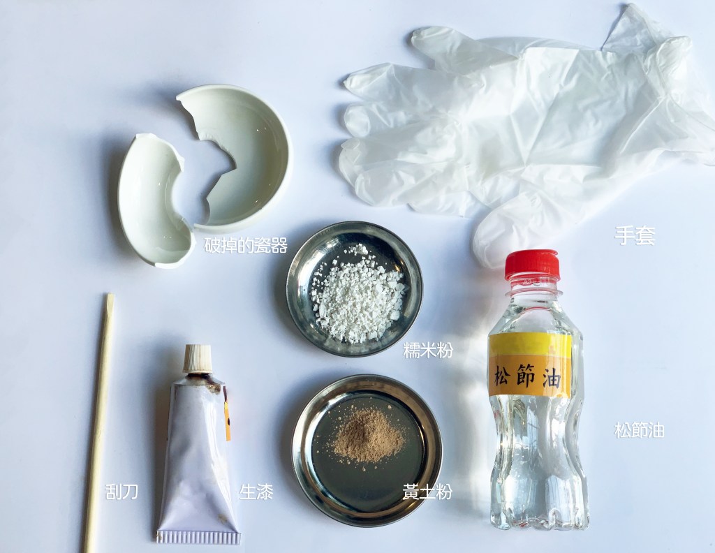 手套、松節油、紙膠帶、黃土粉、糯米粉、刮刀、生漆、抹布、紙箱
