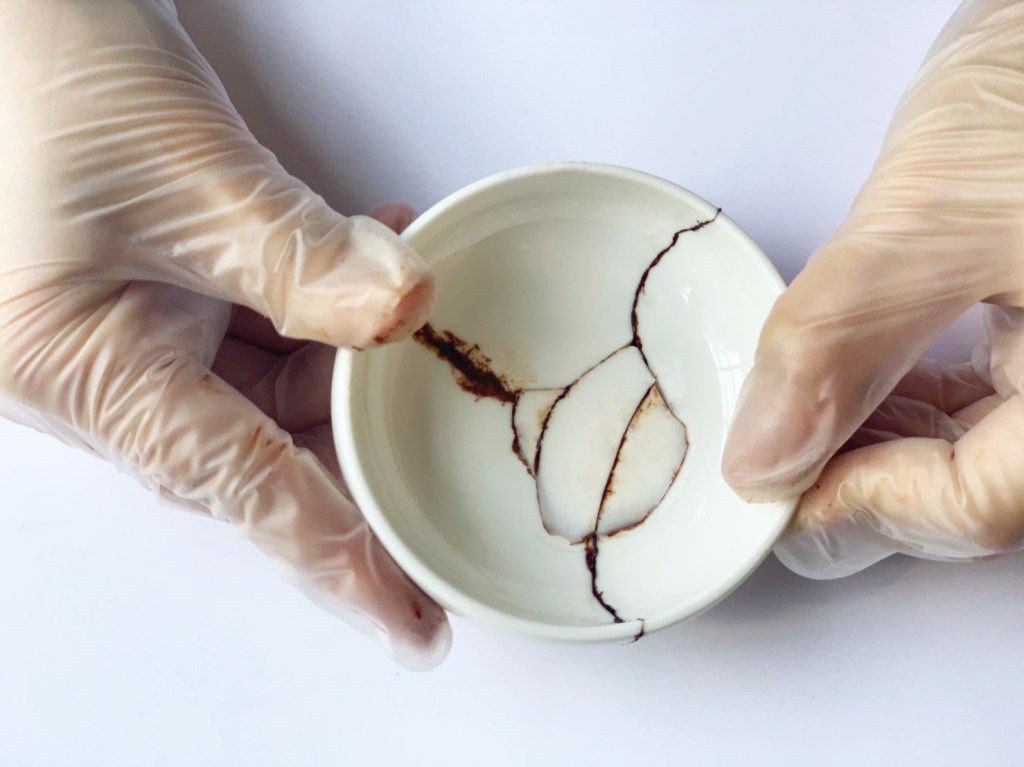 金繼,起源於日本,是以天然的生漆(漆樹的汁液)將碟子、杯子等破損的器物重新黏合,再塗上金粉(除了金粉之外也會使用銀粉或是錫粉哦!)塗漆黏合需經過長時間乾燥,才能繼續下個步驟,是非常耗時的修補技術。