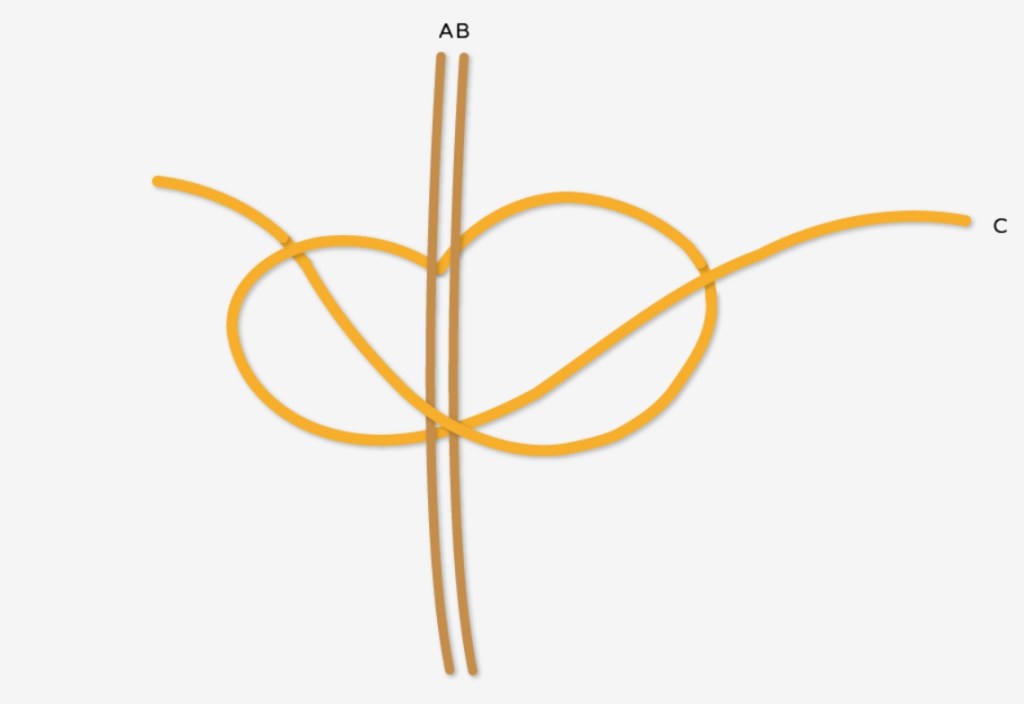 取兩結中間的兩段線打固定單結(如圖為取A結的2跟B結的1)