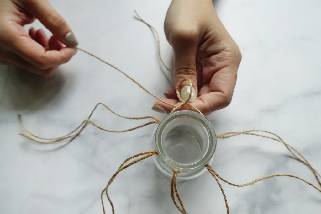 接著整段線繞至瓶口處,交接點打結綁緊。