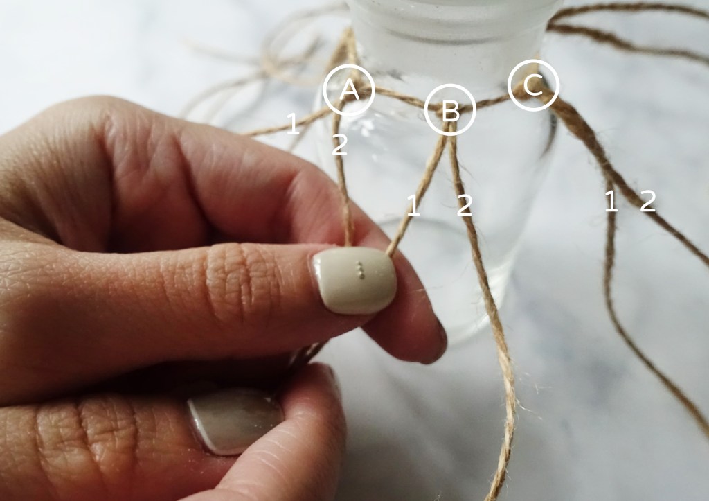 將②網狀的線段平均綁在①瓶口那段線上,用定位結的綁法綁緊!