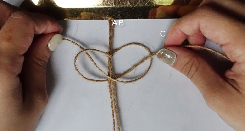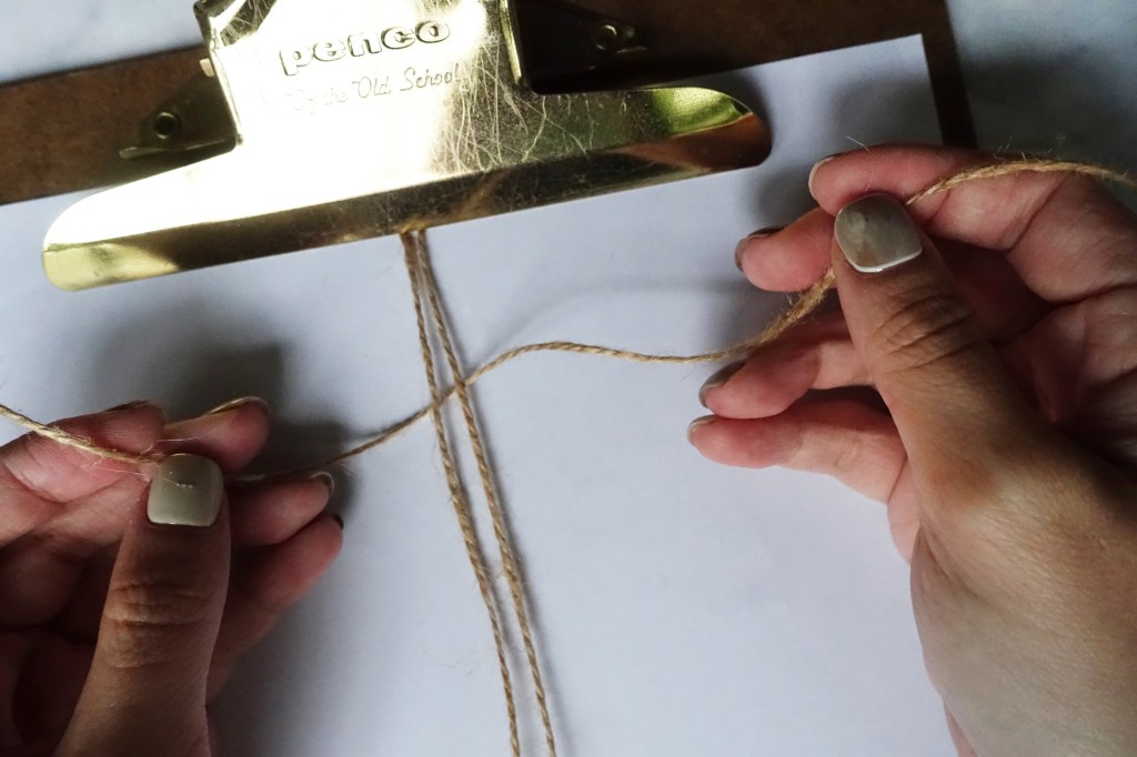 製作把手時可以用夾子輔助固定麻線,把線段繞成像無限的樣子並打結。