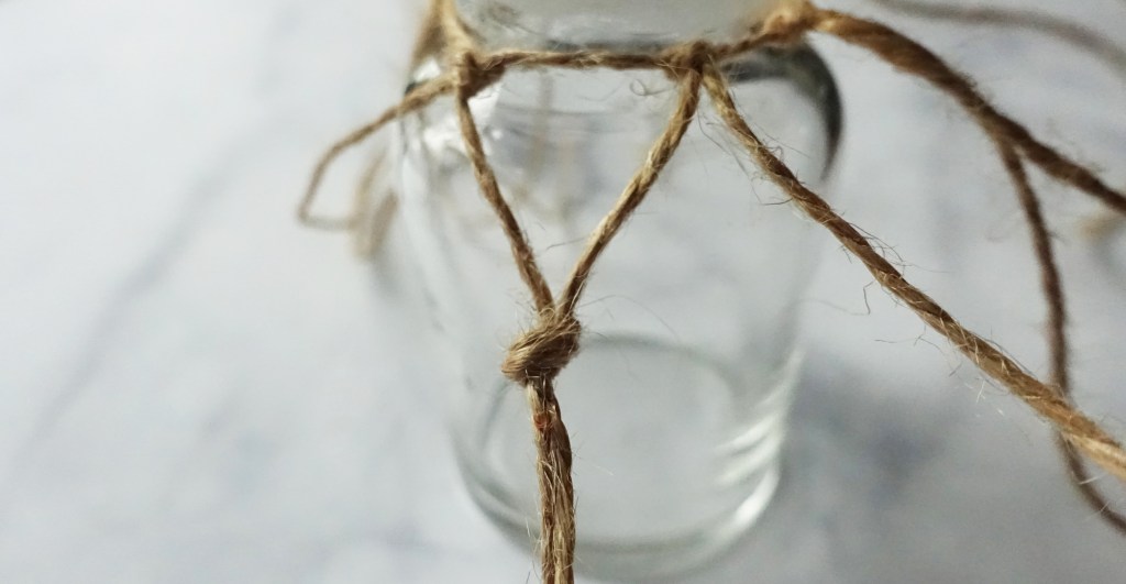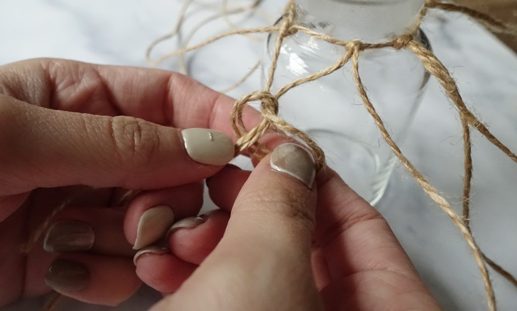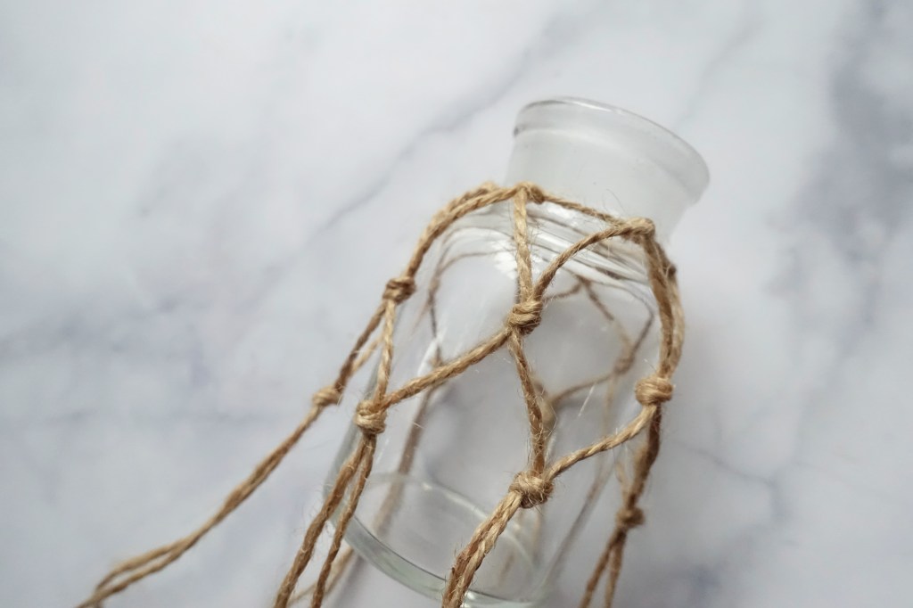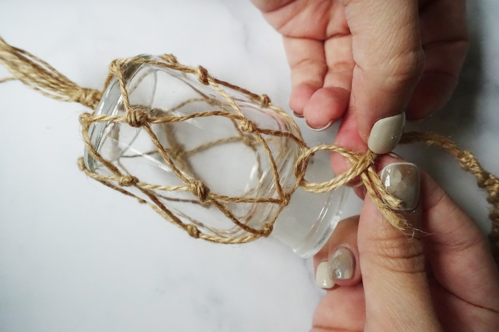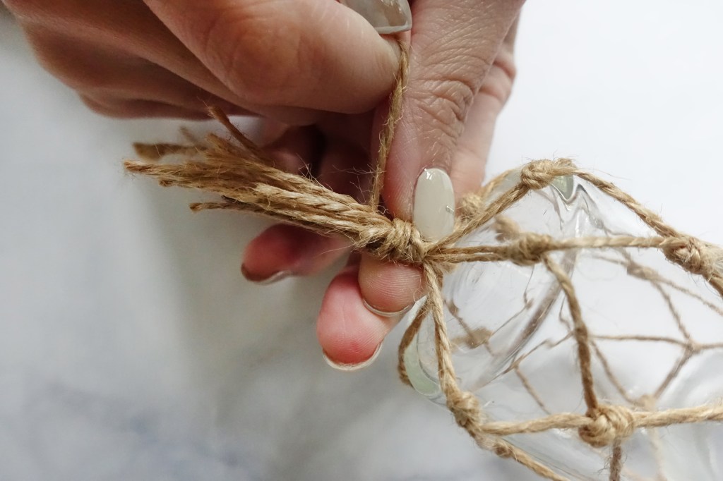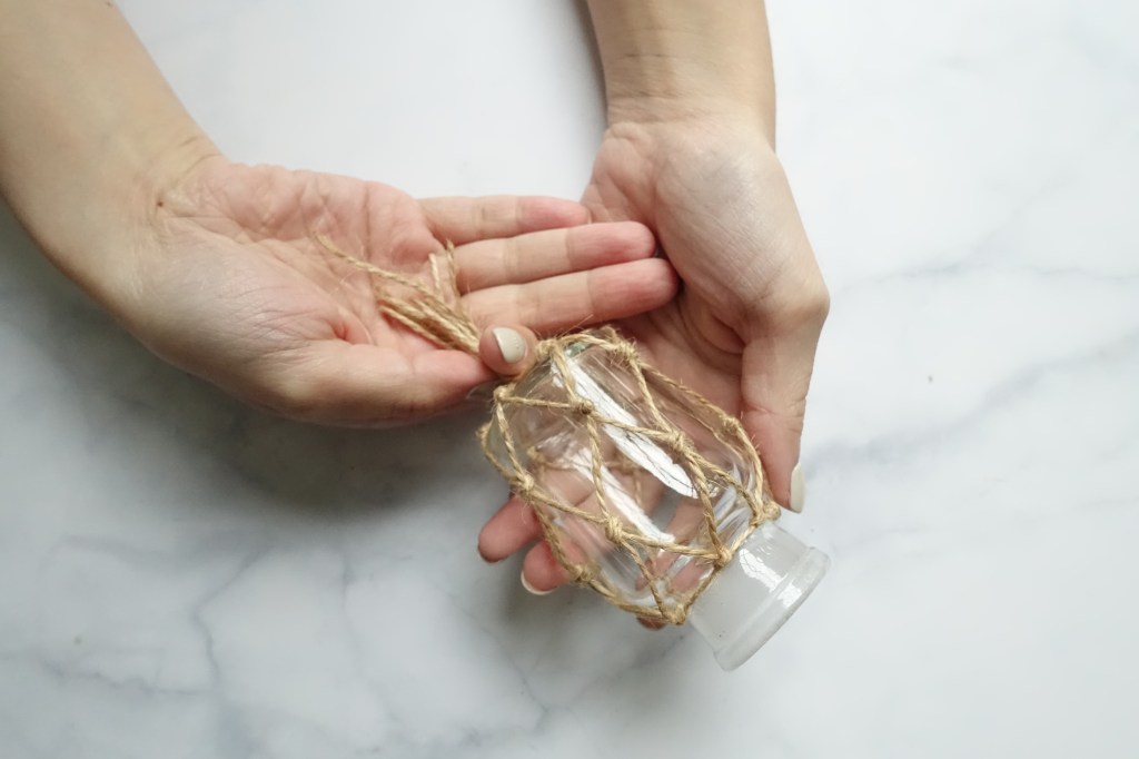 依此類推,重複相同的動作將麻繩綁完,編到接近瓶底。