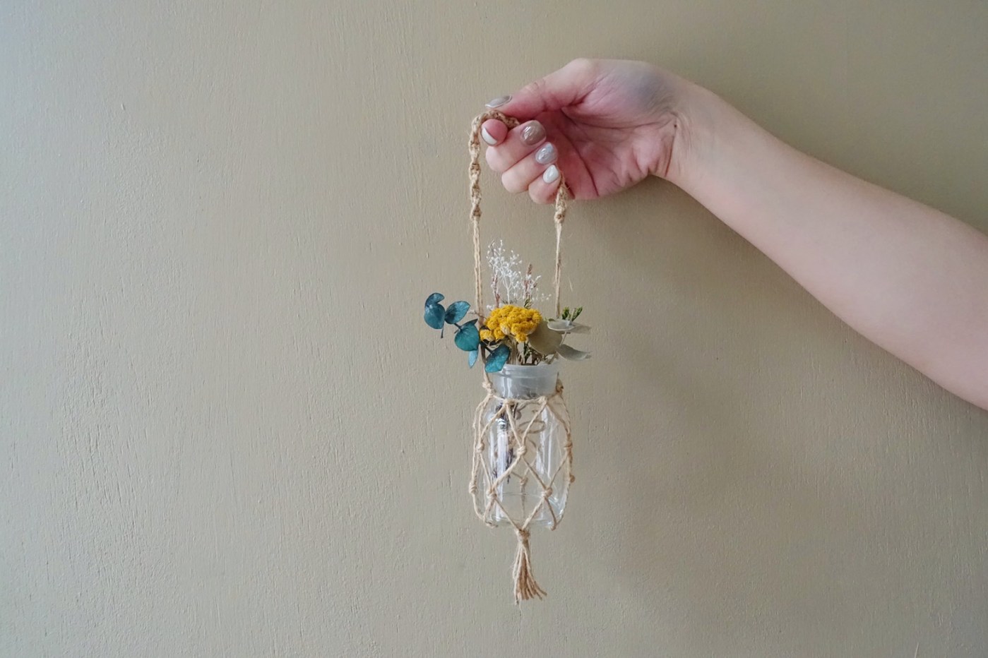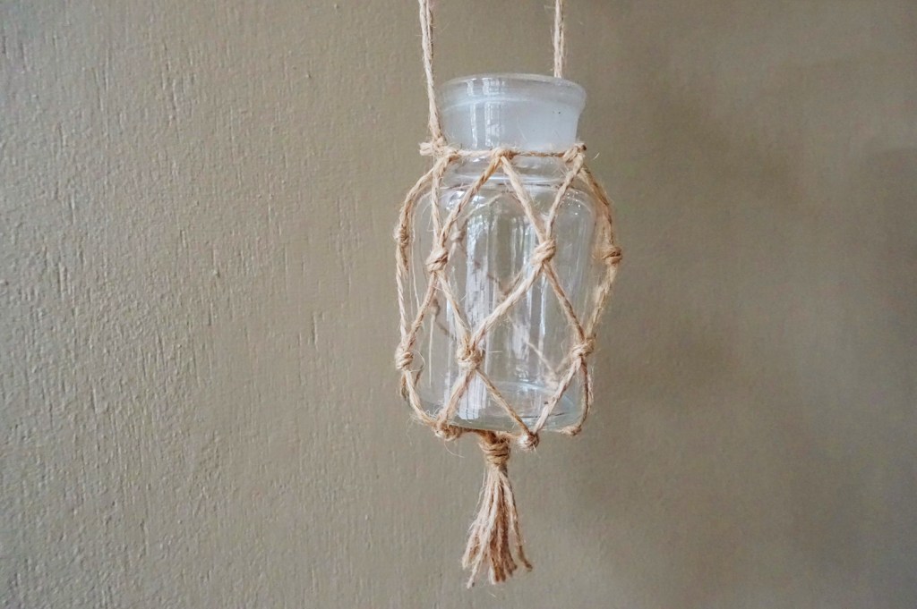完成後的瓶子再插上幾枝乾燥花做裝飾,或當作盆栽的吊盆也很好看~