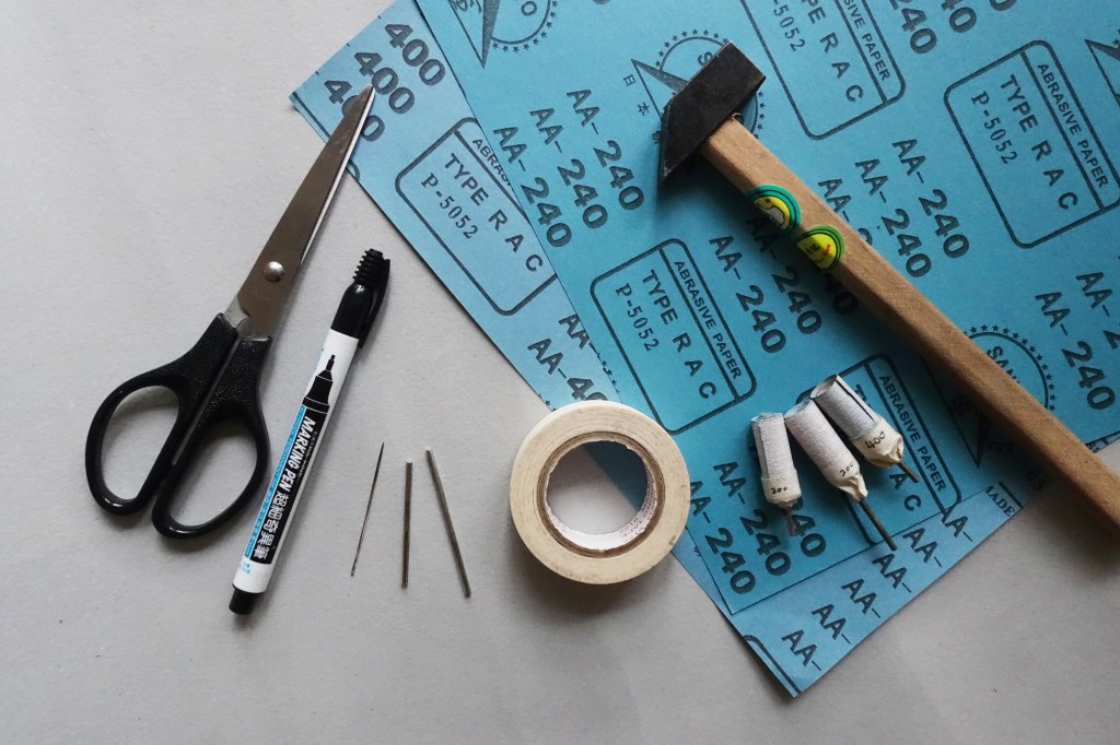首先介紹一下會使用到的工具。我們需要準備砂紙、砂紙夾、粗針、剪刀、膠帶、槌子跟筆。市面上買到的砂紙夾分為有溝槽跟沒有溝槽兩種,還有各種長度大小跟形狀,大家可以依照自己的需求跟習慣做選擇。這邊會介紹2種自製砂紙棒的方式給大家參考~
