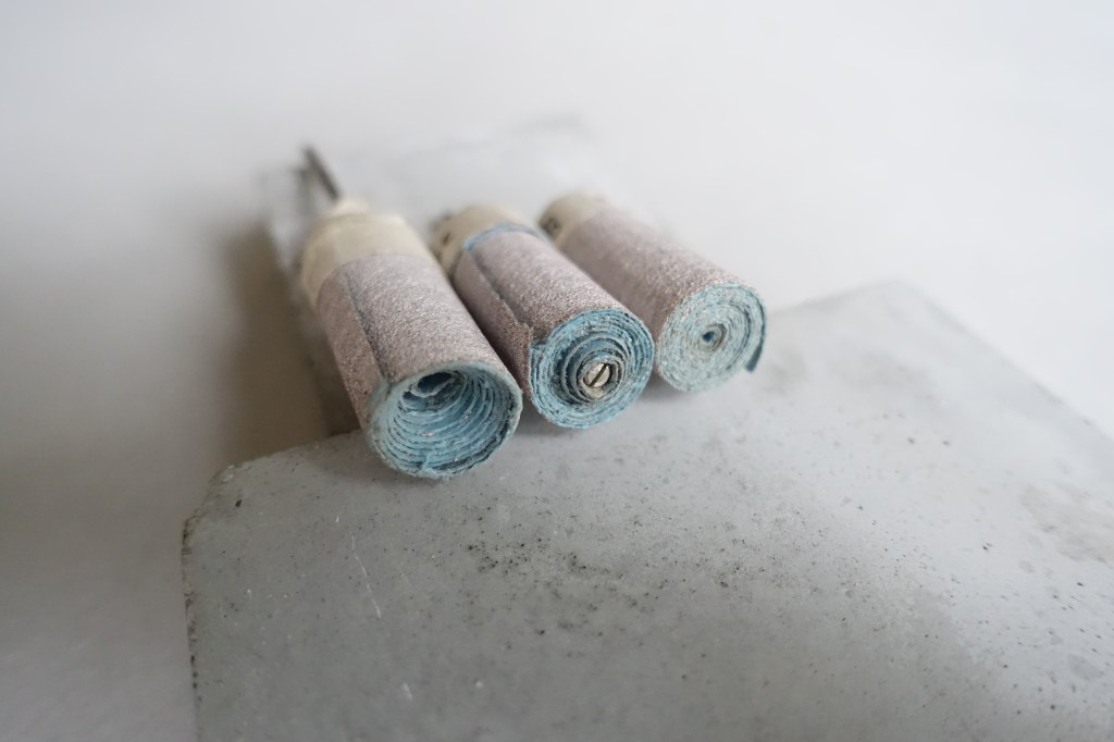 完成後檢查一下砂紙棒的頂端,微凹陷或是平面是最好的狀態。像圖片中間中心軸凸起的砂紙棒在使用時會因為空間受限,細部的地方就會較難修整完全。
