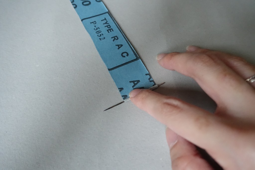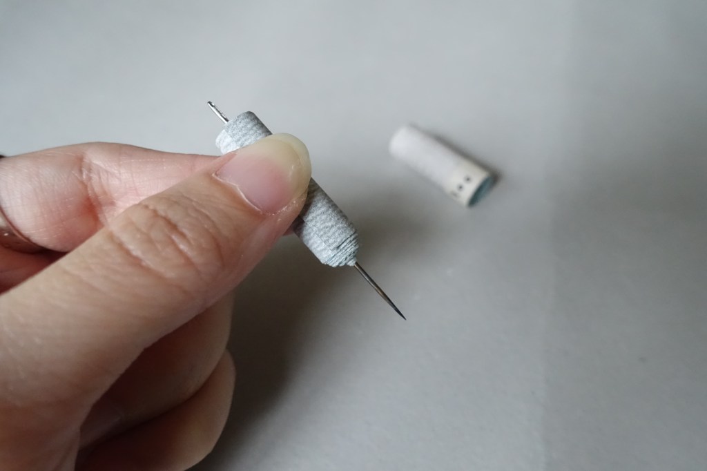 前面的步驟跟第一個方法相同,先將砂紙剪成長條型,然後用粗針把砂紙一端捲起來,中間需要留一點小縫隙,不能捲得太緊哦!因為下個步驟我們會把砂紙夾敲打進中間的縫隙裡~捲好後需要特別注意砂紙的方向性,可以從砂紙棒上方觀察,逆時鐘旋轉的手鑽,是搭配由內順時鐘往外旋出的砂紙棒,最後再用紙膠帶固定好寫上號數就可以進行下個步驟了!