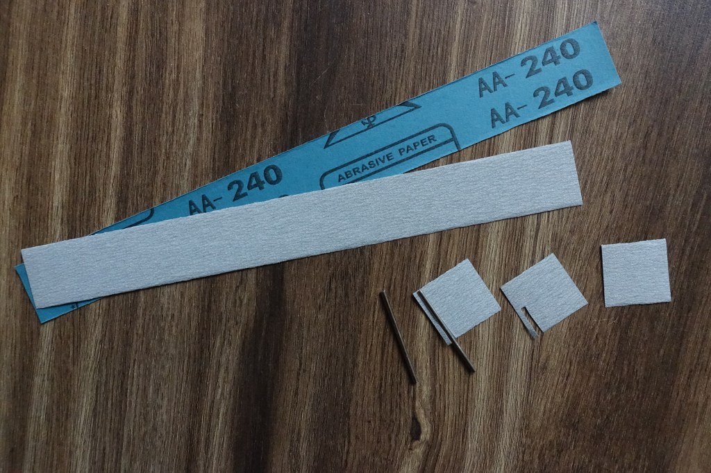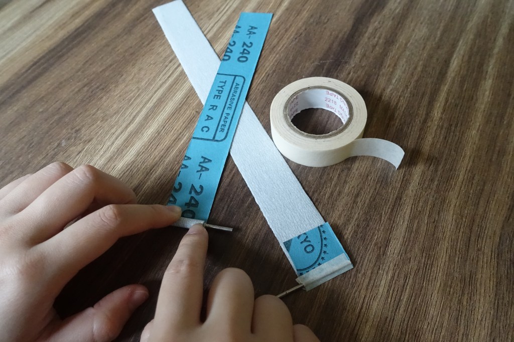 首先把砂紙短邊對折、對折再對折,一張砂紙可以分割成8份長條,製作8個砂紙棒。將長條砂紙前端剪下一段約正方形大小的砂紙,再將正方形砂紙上剪出一個缺口。把準備好的砂紙夾(有溝槽)卡入缺口中,砂紙夾前端會跟砂紙齊平或是略低一點,這時候再用紙膠帶固定好砂紙跟砂紙夾就完成第一個步驟了!