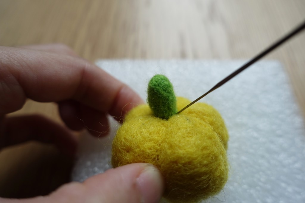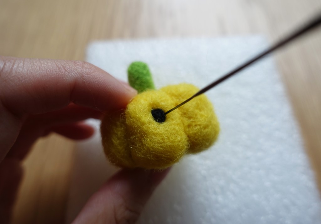 用綠色戳出長條形,作為蒂頭,接著將蒂頭放在南瓜上,戳接合處固定就完成囉!