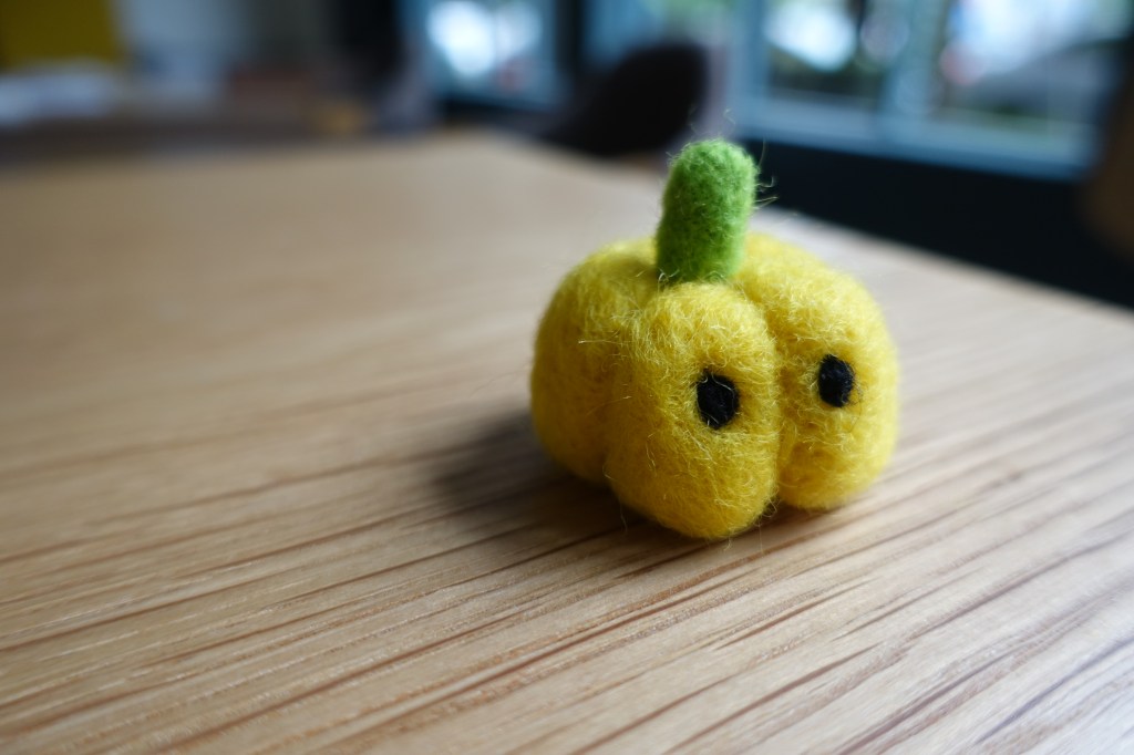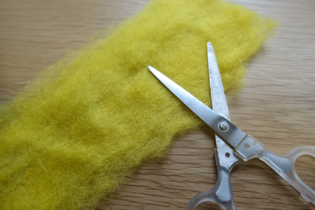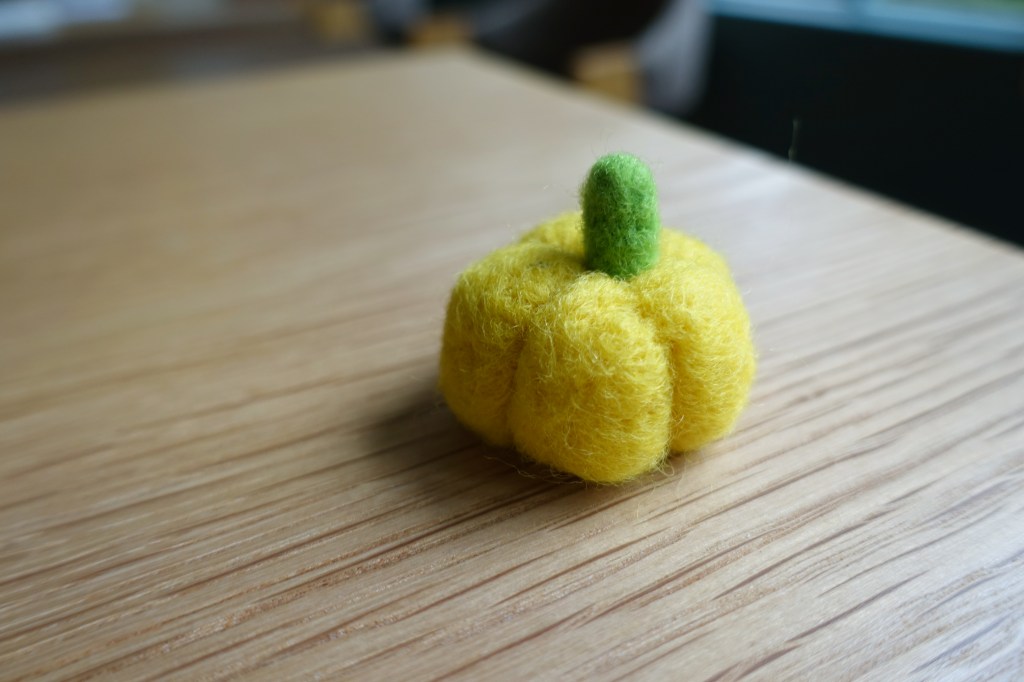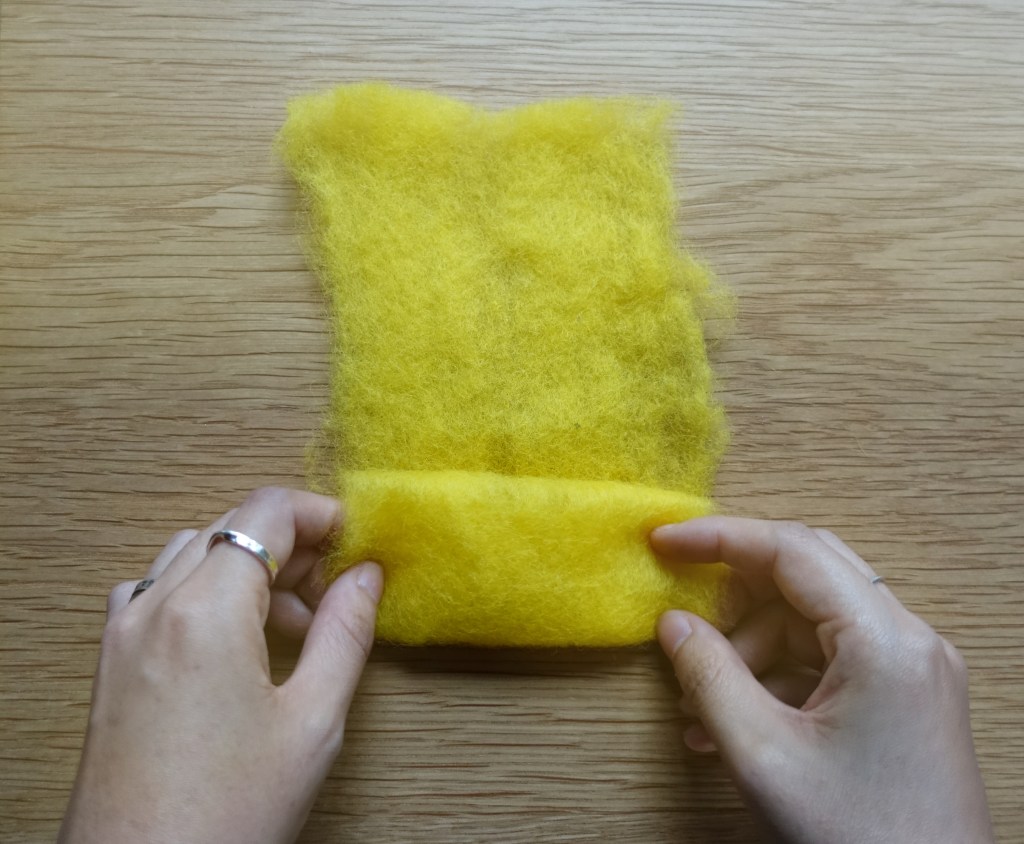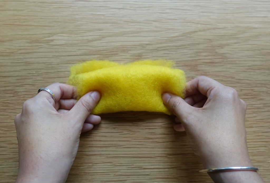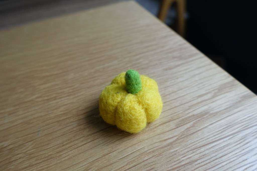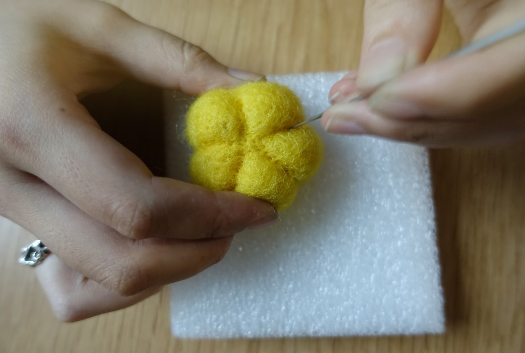 取出南瓜的黃色羊毛,長條狀由下往上捲起,