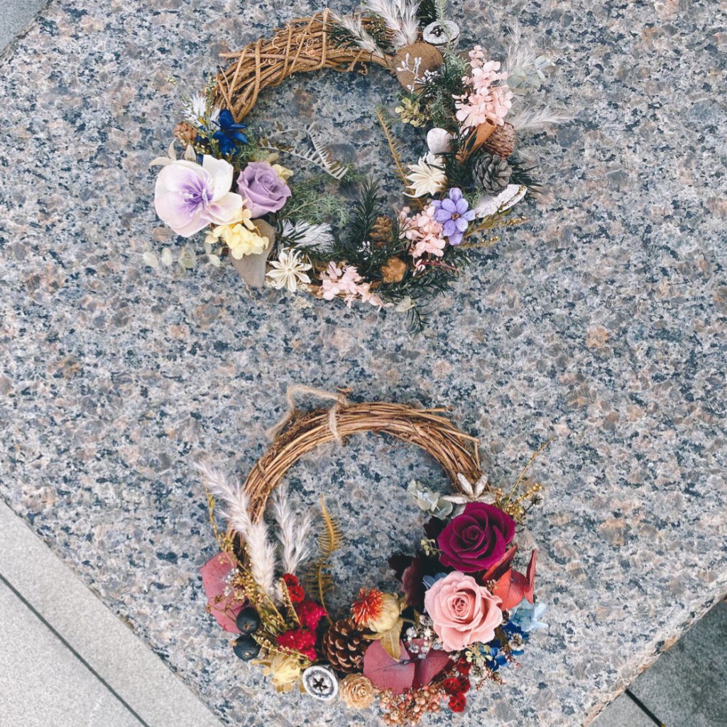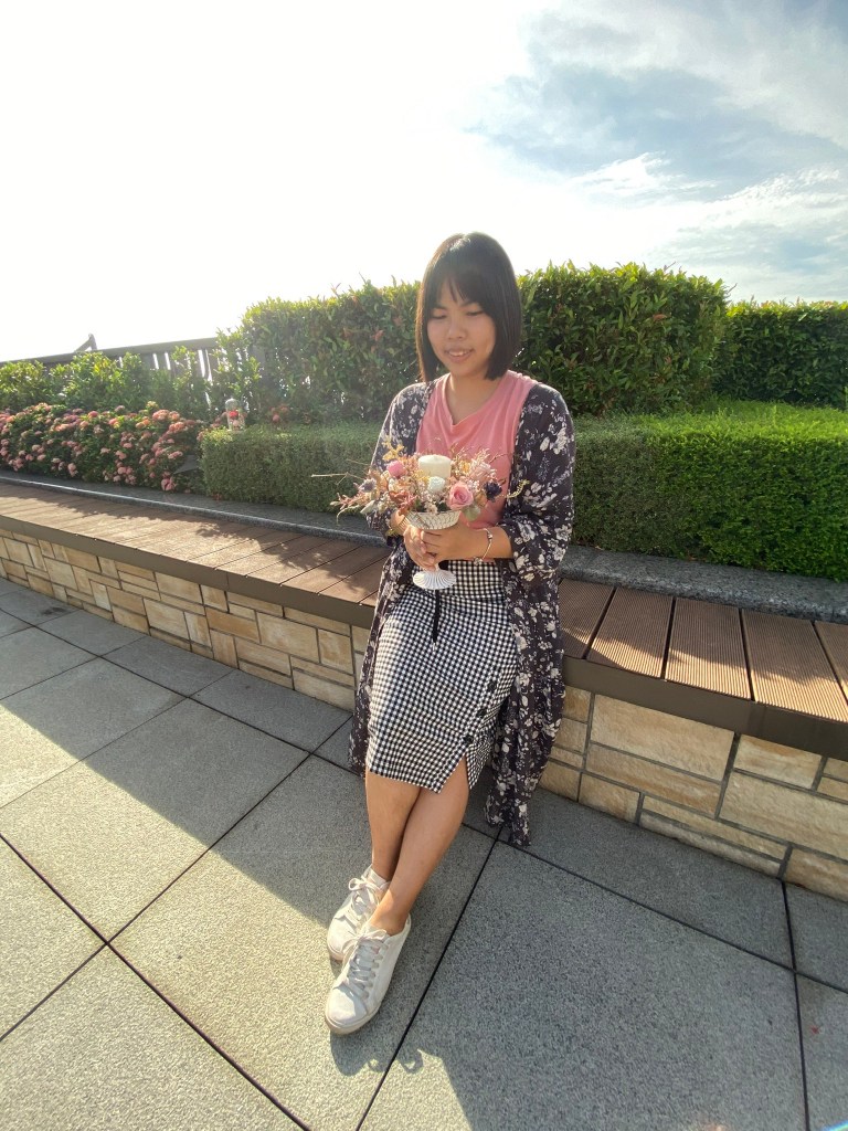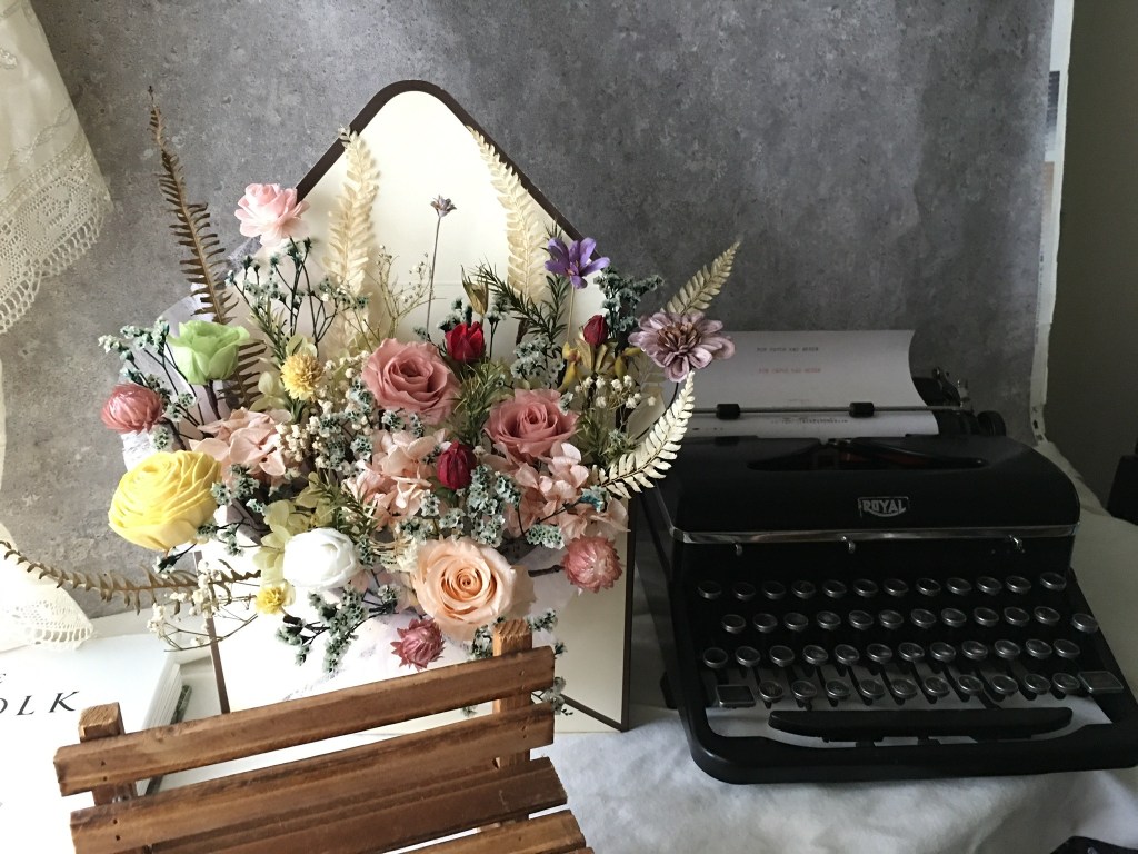又開始重新接觸花藝,是出社會後,同事邀請 Lucy 去上一堂不凋花的體驗課程,那時候才發現,原來小時候覺得厭煩的事物,竟是最能讓自己感到療癒放鬆的事情。於是開始重回花藝世界,在工作閒暇之餘創作,一直到今年,更認真的去上長期的花藝創作創業課程,目前仍持續在上課進修。
